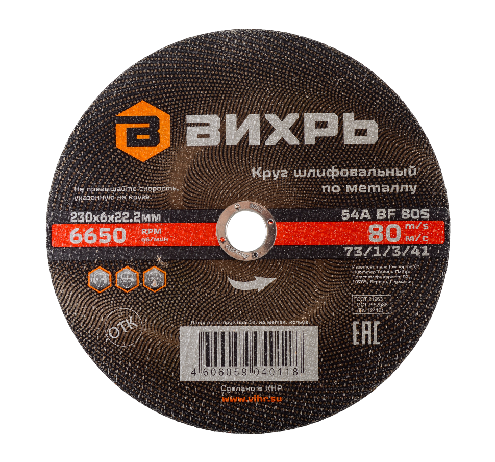 Круг шлифовальный по металлу Вихрь 230х6х22,2 мм для предварительной и финишной обработки изделий из разных материалов.