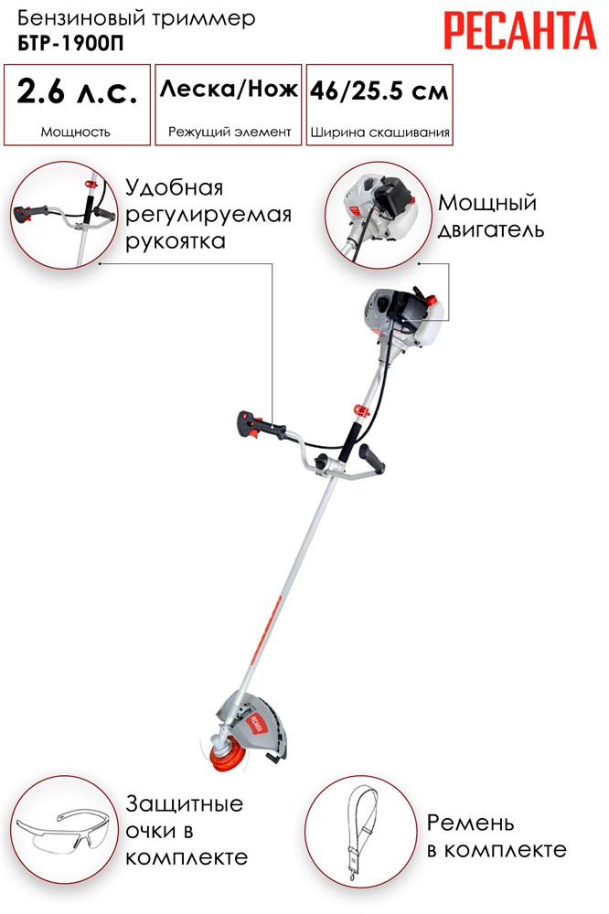 Триммер бензиновый БТР-1900П Ресанта - отличный ручной моторизированный инструмент для скашивания травы. Представляет собой современный вариант традиционного для этого вида работ ручного инструмента - косы. Косить траву, особенно если она высокая, триммером очень удобно. Как правило, владельцы участков отдают приоритет бензиновым моделям, ведь не на каждой даче есть электричество, а провода создают дополнительное неудобство. Главное - это выбрать нужный триммер, которым будет удобно работать. Неплохо, чтобы его мощность позволяла легко снимать даже древесную поросль и кустарники.