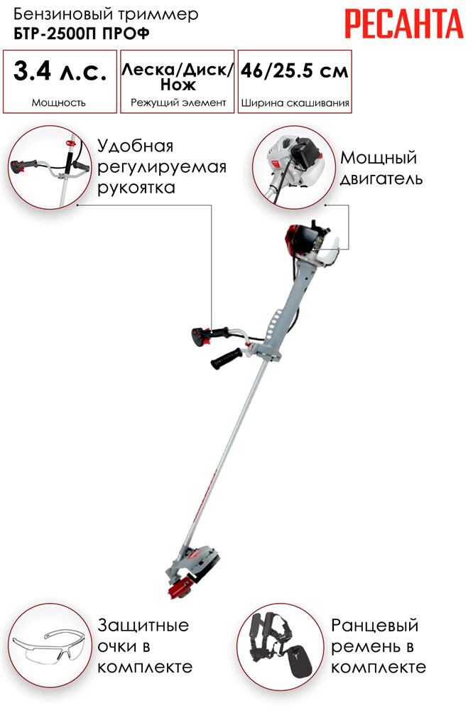 Триммер бензиновый БТР-2500П ПРОФ Ресанта (с антивибрационной системой) - мощный инструмент для скашивания, представляет собой современный вариант традиционного для этого вида работ ручного инструмента - косы. В новом сезоне в модельном ряду бензиновых триммеров появилась линейка с профессиональной антивибрационной системой. Часто дачники отдают приоритет этой бензиновой модели, ведь не на каждом участке есть электричество, а провода создают дополнительное неудобство. Мощность триммера позволяет снимать не только высокую и низкую траву, но древесную поросль и кустарники. Кроме того, у этой модели не плечевой ремень, а ранцевый, что облегчает работу с триммером.