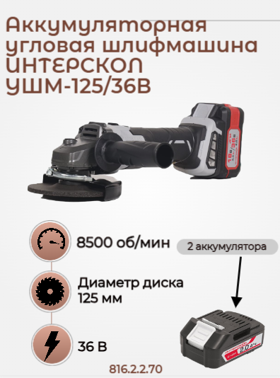Бесщеточная аккумуляторная угловая шлифмашина УШМ-125/36В 125 мм, АПИ 36В, 2 АКБ 2,0 Ач, ЗУ, кейс