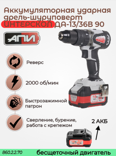 Бесщеточная ударная аккумуляторная дрель-шуруповерт ДАУ-13/36В АПИ 36В, 90 Нм,2 АКБ 2,0Ач,ЗУ,кейс