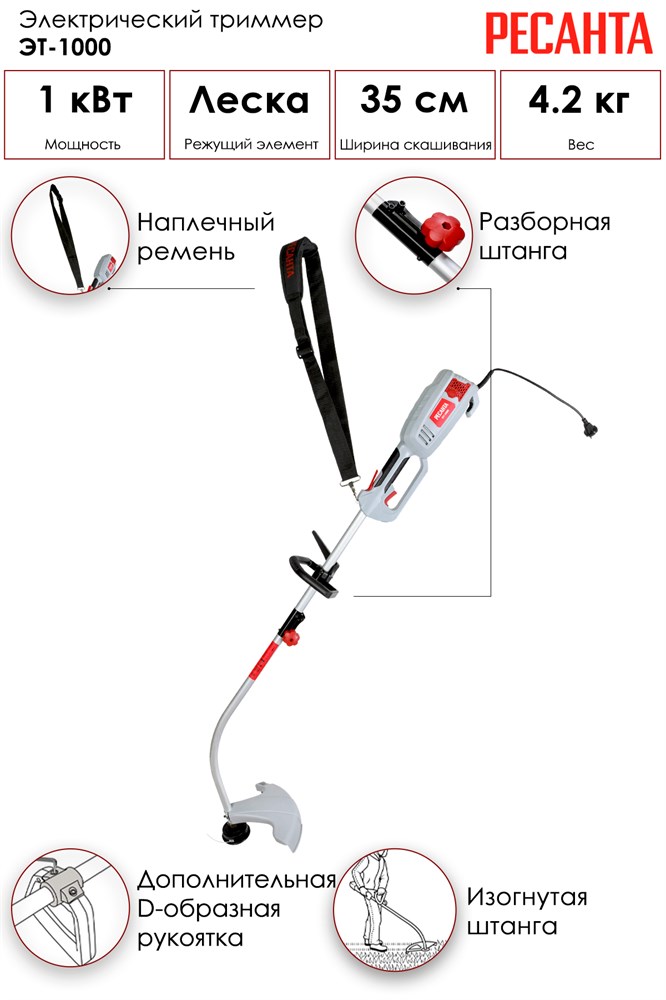 Триммер электрический ЭТ-1000 Ресанта - надежный инструмент для скашивания травы на небольших газонах, вокруг клумб и деревьев. Изогнутая штанга упрощает работу в труднодоступных местах. Отличием является разъёмная штанга, которая экономит место во время хранения и упрощает транспортировку триммера.