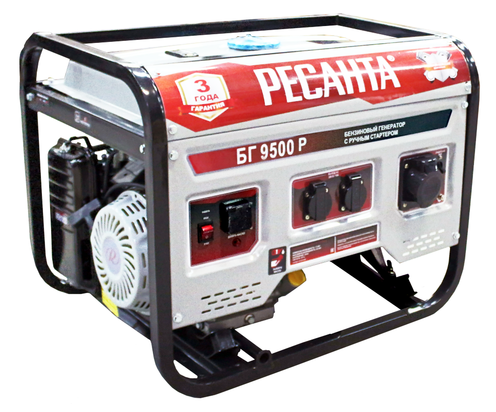 Электрогенератор бензиновый (бензогенератор) - электрическая машина, предназначенная для автономного электроснабжения в повторнократковременном режиме потребителей бытового и аналогичного назначения, относящихся к классу переносных электроприемников. В качестве первичного двигателя используется карбюраторный двигатель, топливом для которого является неэтилированный бензин. В условиях временного или постоянного отсутствия электроэнергии обеспечить питание электрооборудования можно с помощью генератора РЕСАНТА модели БГ 9500 P. Бензогенератор демонстрирует высокий КПД и хорошие показатели мощности. Генератор РЕСАНТА БГ 9500 P имеет увеличенный ресурс двигателя, медную обмотку альтернатора. Оснащен многофункциональным цифровым дисплеем с индикацией величины напряжения, частоты тока и счетчиком моточасов. Агрегат оснащен надежным одноцилиндровым двигателем, который работает на неэтилированном бензине. Сфера применения установки включает в себя, как коммерческие объекты (магазины, ларьки, офисы), так и загородные дома, дачи, подсобные хозяйства. При покупке бензинового генератора Ресанта БГ 9500 P, Вы останетесь довольны его прекрасной производительностью и компактным внешним видом.