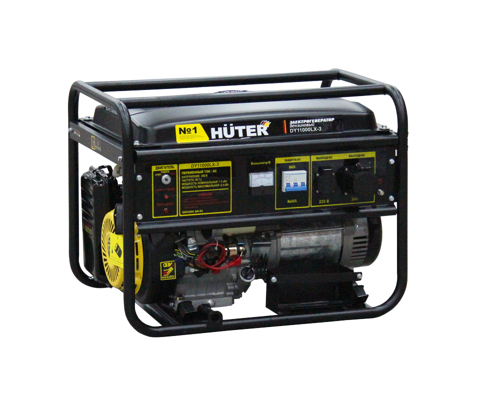 Бензиновый генератор Huter DY11000LX-3 – портативная компактная электростанция, обеспечивающая электроснабжение бытовой техники и профессионального оборудования, питающегося от трёхфазной сети 380 Вольт. Это самый выгодный бензиновый электрогенератор, с оптимальными техническими характеристиками и низким расходом топлива.Модель DY11000LX-3 может использоваться в качестве резервного источника питания для частных домов и квартир, а также как постоянная станция, обеспечивающая работу электроприборов в полевых условиях. Генерирующая установка имеет синхронный тип устройства и щёточный механизм.Комплектация:Бензиновый электрогенератор.Силовая вилка 32 АСвечной ключ. Вороток либо отвёртка (в зависимости от модели)Провода и детали лотка аккумуляторной батареи (для моделей с X в названии)Комплект резиновых опор с гайкамиКлюч электростартера (для моделей с обозначением X)Паспорт (руководство по эксплуатации)Бензиновая электростанция Huter DY11000LX-3 оборудована мощным одноцилиндровым четырёхтактным двигателем внутреннего сгорания, мощностью 19 л.с. Запуск производится ручным стартером или электростартером от АКБ (аккумулятор не входит в комплектацию и приобретается отдельно). Для удобства транспортировки, отдельно можно приобрести колёса и ручки. Электрогенератор DY11000LX-3 имеет рабочую мощность 8,5 кВт, а также все виды защиты – от перегрузки, короткого замыкания и низкого масляного уровня.