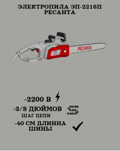 Отличительными особенностями электропилы Ресанта являются простота и удобство в работе, ведь она не требует заправки топливом и работает от сети 220В. Также стоит отметить низкий уровень шума, создаваемый при работе, а также полное отсутствие выхлопных газов. Это означает, что вы можете использовать пилу не только на улице, но и в помещении при ремонтных и строительных работах. Вы можете легко регулировать натяжение цепи с помощью винта, расположенного на корпусе справа. Прямая передача мощности - проста и надежна. К характеристикам, обеспечивающим комфортное пользование инструментом, также можно отнести автоматическую смазку цепи. Чтобы вы смогли определить уровень смазки для цепи, в корпусе есть смотровое окошко с делениями. Единственная особенность - это недостаточная мобильность, ведь пользоваться инструментом можно только в непосредственной близости от розетки переменного тока 220В. Этот легко исправить, используя переноску (с кабелем подходящего сечения!) или бензогенератор Ресанта. Для электропилы ЭП-2216 подойдут цепи со следующими параметрами: количество звеньев 57, шаг цепи 3/8, толщина ведущего звена 1.3, шина 161.