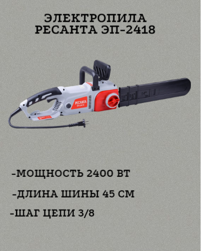 Электропила Ресанта ЭП-2418 является самым мощным инструментом в линейке бытовых пил. Аппарат служит для лёгких и средних работ: распиловка бревен, валка садовых деревьев, обрезка сучьев. Благодаря обрезиненной рукоятке держать такой агрегат в руках удобно и комфортно. Привод цепи осуществляется за счет электродвигателя, который работает от сети переменного тока 220В.