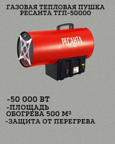 Газовая тепловая пушка РЕСАНТА ТГП-50000 – воздухонагреватель, работающий на сжиженном газовом топливе. Топливо необходимо для получения горячей атмосферы в камере сгорания, а электроэнергия, подводимая к устройству, необходима для питания вентилятора, нагнетающего воздух, и для функционирования автоматики. Газовые пушки прямого нагрева являются простой и надёжной конструкцией без дымохода, где горячий воздух из устройства поступают в помещение.