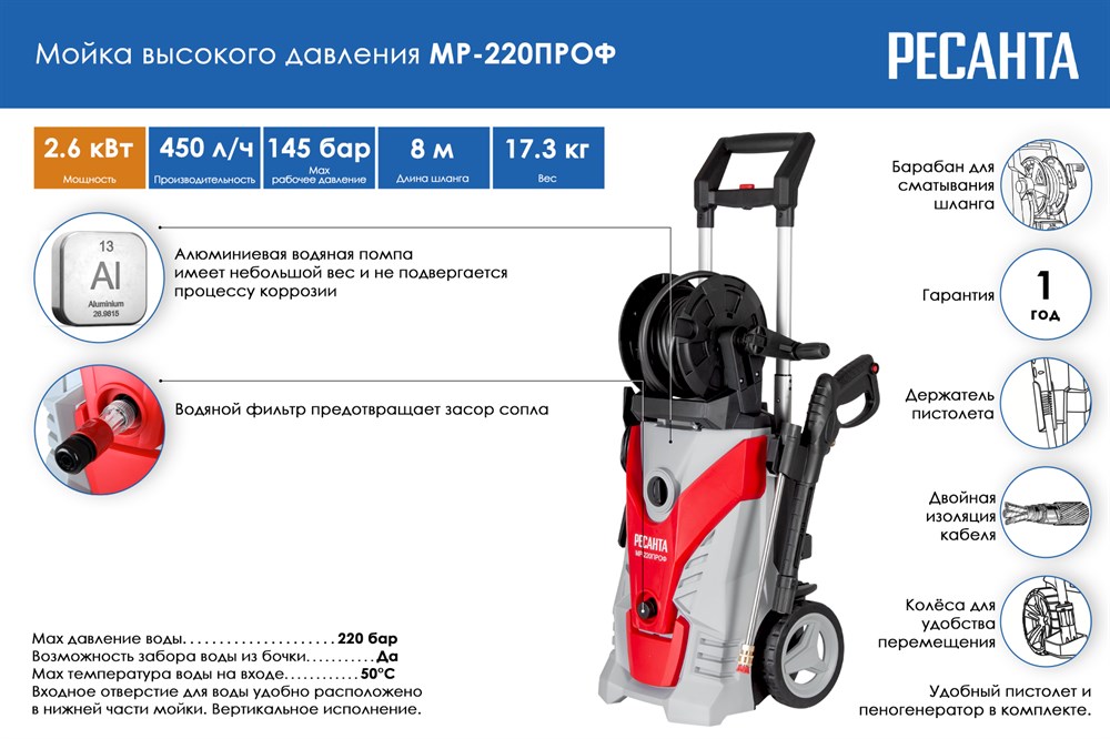 Мойка высокого давления Ресанта предназначена для мойки велосипедов, транспортных средств, авто и мототехники, фасадов зданий, дорожек, садовых принадлежностей и т.д. Мойка МР-220 ПРОФ обладает очень большим ресурсом благодаря надёжному бесщёточному асинхронному электродвигателю и алюминиевой помпе с водяным охлаждением. Данная мойка имеет целый ряд преимуществ, таких как высокая мощность и производительность, удобный барабан для шланга, телескопическая рукоятка, профессиональный пеногенератор, 8-метровый шланг высокого давления. Возможность забора воды даже из ёмкости делает её удобной в любых условиях эксплуатации.