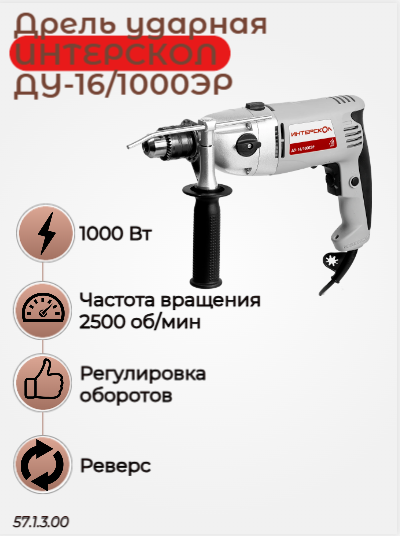 Сетевая дрель ударная ДУ-16/1000ЭР, макс. сверления в древесине 40 мм, 1000 Вт.