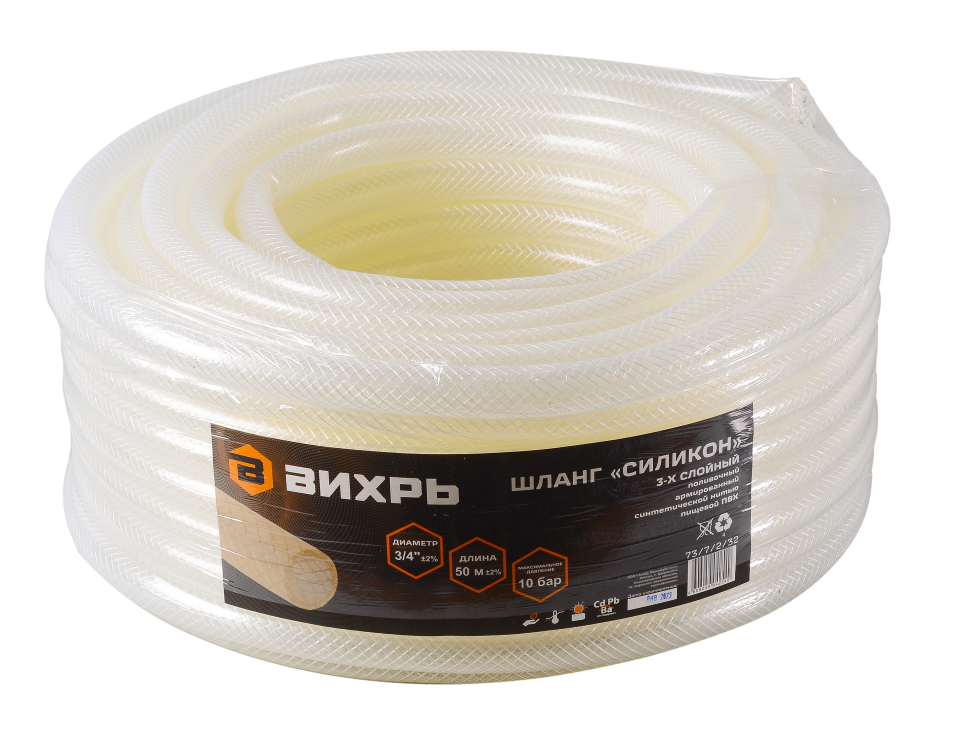 Шланг поливочный Вихрь "Силикон" прозрачный трёхслойный армированный, диаметр - 3/4", длина - 50м.