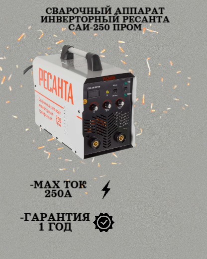 Сварочный аппарат Ресанта САИ-250 ПРОМ – инверторный источник питания постоянного тока, разработанный для ручной электродуговой сварки, методом ММА, плавящимся покрытым электродом. Прибор адаптирован под эксплуатирование в сетях с перепадами в диапазоне 380 (±15%) В. Этого вполне достаточно, чтобы обеспечить стабильную работу инвертора Ресанта САИ-250 ПРОМ, в любом режиме нагрузки.