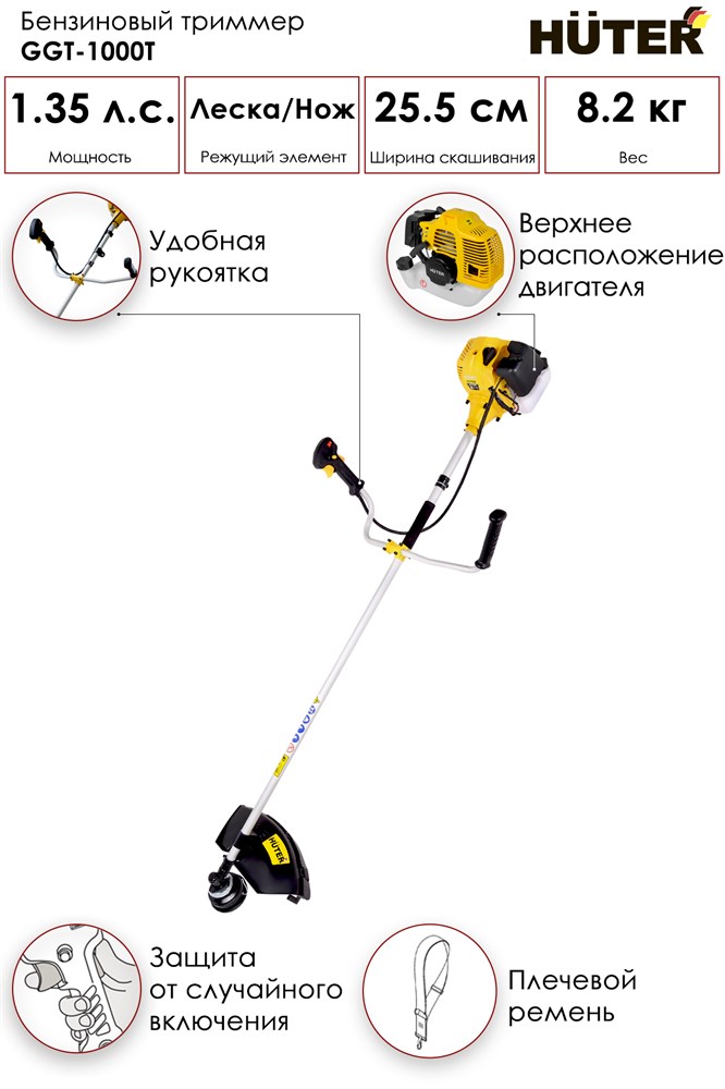 Триммер бензиновый Huter GGT-1000T – отличная альтернатива ручному инструменту, при этом он может использоваться для скашивания высокой и низкой травы и даже применяться для расчистки порослей кустарника. Модель подходит для выполнения работ в небольших объемах, при этом не придется переплачивать за дополнительную мощность.Бензотриммер мощностью 1000 Вт имеет стандартную комплектацию (леску, нож 3Т). Для удобства использования предусмотрен ремень «через плечо». Модель Huter GGT-1000T имеет неразборную (цельную) штангу. Управление триммером находится прямо на рукоятке, поэтому в процессе скашивания травы не возникает затруднений.Работает бензотриммер от двухтактного двигателя с воздушным охлаждением. Стандартная система антивибрации минимизирует возможный дискомфорт во время работы. Полупрозрачный бак позволяет легко следить за уровнем топлива и при необходимости своевременно выполнять дозаправку. Чтобы триммер бензиновый было безопасно эксплуатировать, предусмотрен защитный кожух, блокиратор кнопки нажатия газа. Очки в комплекте не идут.Для приготовления топливной смеси производитель рекомендует использовать фирменное полусинтетическое моторное масло для двухтактных двигателей «HUTER 2T».Схожая модель Huter GGT-1000S имеет разъемную штангу.
