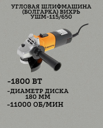 Углошлифовальная машина (болгарка) ВИХРЬ УШМ-115/650 используется для зачистки, шлифования поверхности, резки материала.