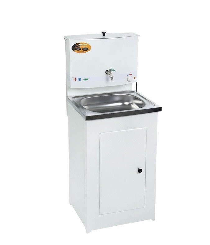 Умывальник с подогревом, белого цвета, с тумбой и нержавеющей мойкой, от российского производителя ВИХРЬ.
